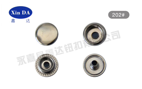 四合扣是紐扣的一種,俗稱彈簧扣、車縫鈕。四合扣靠S型彈簧結(jié)合,從上到下分為ABCD四個(gè)部件:AB件稱為母扣,寬邊上可刻花紋。中間有個(gè)孔,邊上有兩根平行的彈簧;CD件稱為公扣。中間突出一個(gè)圓點(diǎn),圓點(diǎn)按入母扣的孔中后被彈簧夾緊,產(chǎn)生開(kāi)合力,固定衣物。